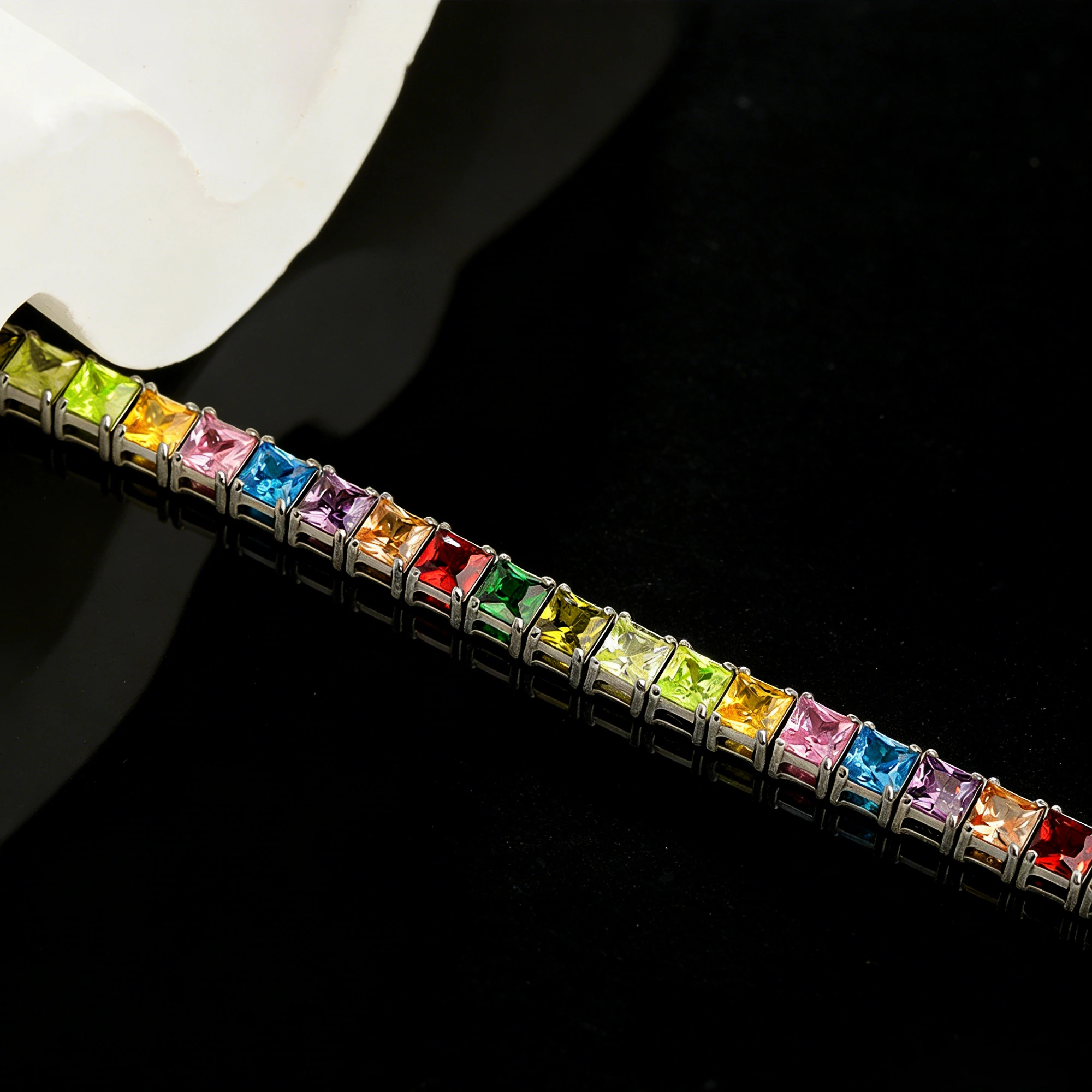 Gradient-colored cubic zirconia set in durable titanium steel. Adjustable tennis bracelet for vibrant, everyday elegance.