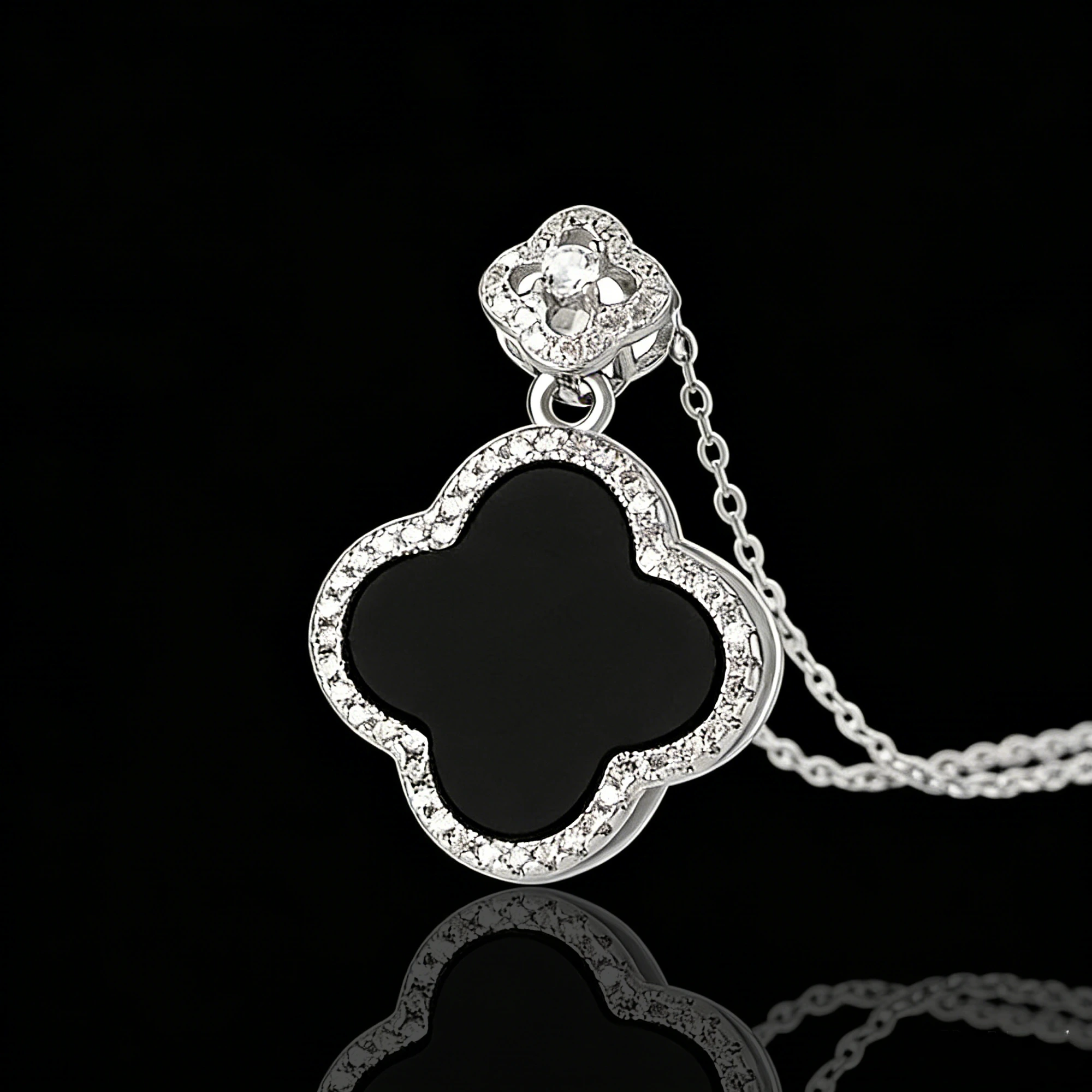 Elegant S925 silver inlaid Burmese black jade clover pendant necklace. Natural black jade, hypoallergenic silver, and lucky clover design for timeless charm and positive energy.