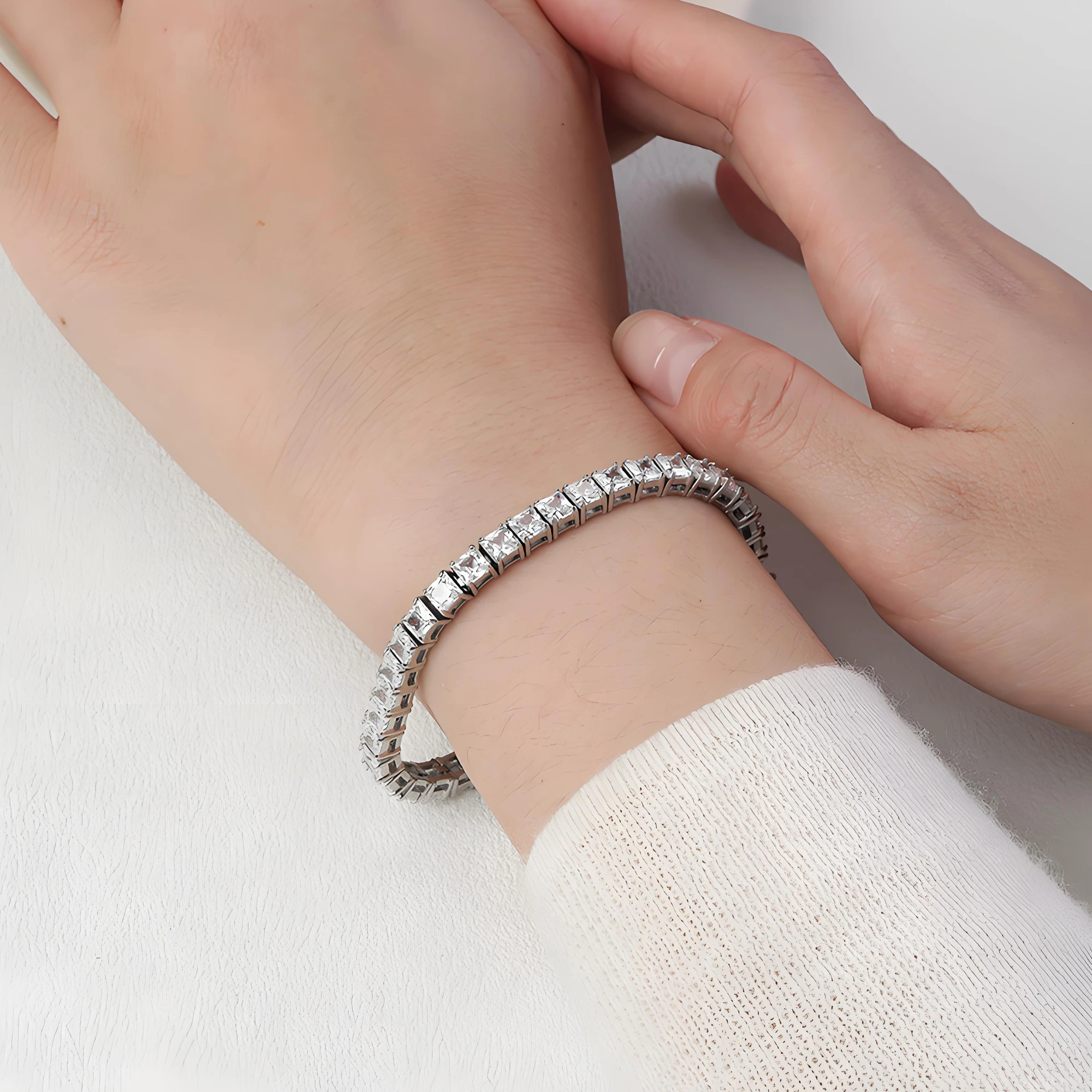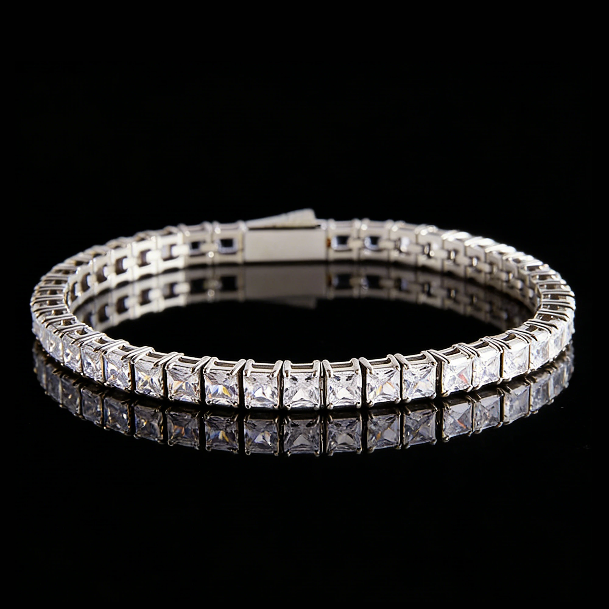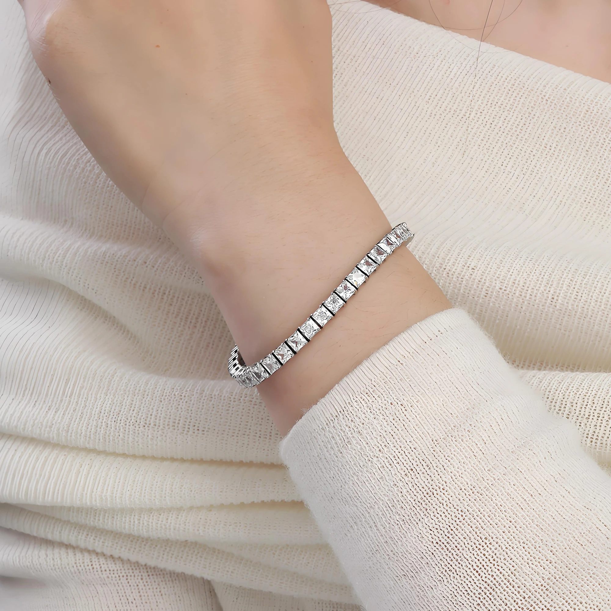 Sharp square-cut cubic zirconia stones set in hypoallergenic titanium steel. A sleek, modern tennis bracelet for timeless everyday sparkle and durable wear.